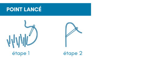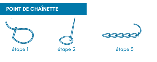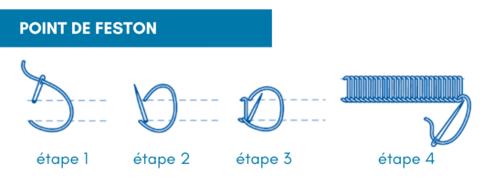 Le point de feston : parfait pour border un motif ou habiller le bord d’un tissu avec élégance. Tutoriel : sortez l’aiguille au bord du tissu, piquez perpendiculairement au bord et formez une boucle sous la pointe de l’aiguille avant de tirer. Répétez régulièrement.